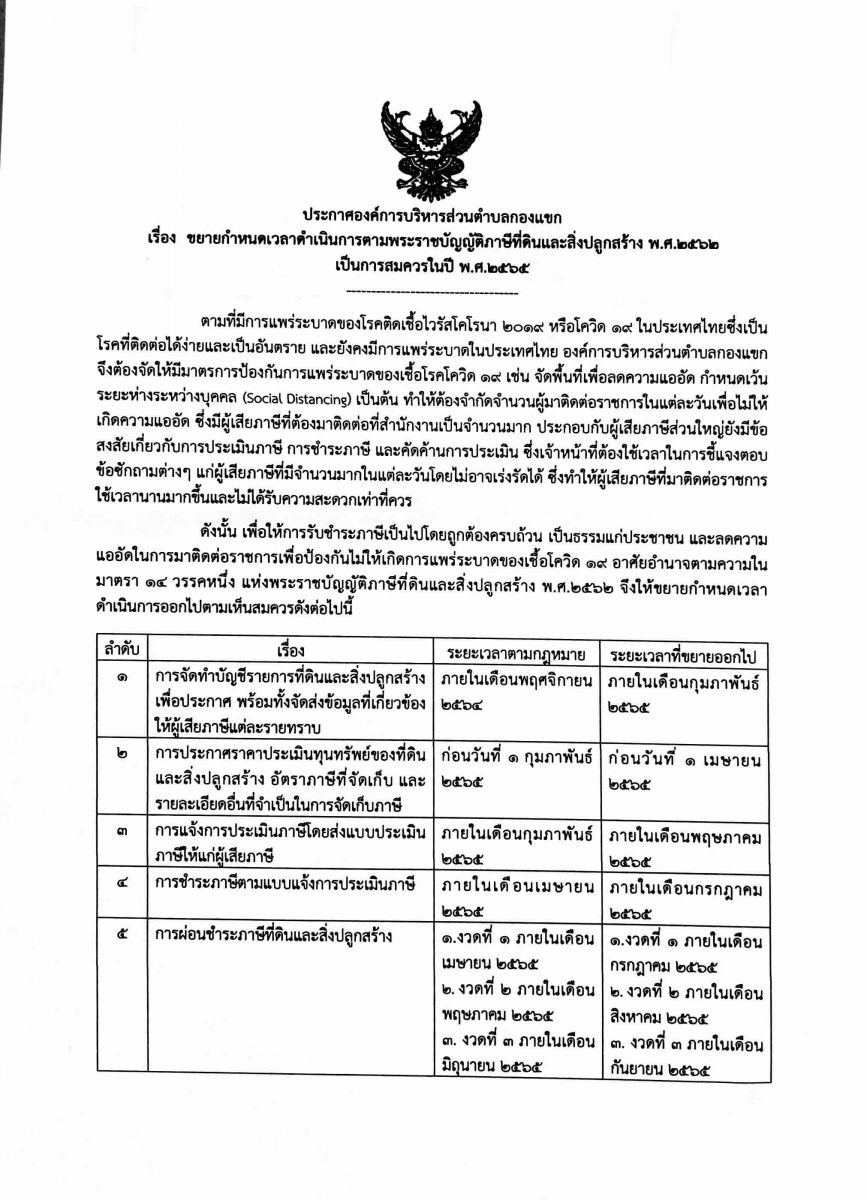 ขยายกำหนดเวลาดำเนินการตามพระราชบัญญัติภาษีที่ดินและสิ่งปลูกสร้าง พ.ศ.๒๕๖๒