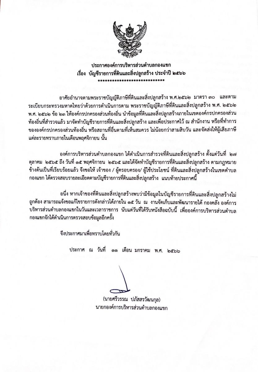ประกาศบัญชีรายการที่ดินและสิ่งปลูกสร้าง ประจำปี2566